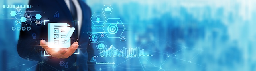 Assessment: Businessman holding assessment icon. Digital technology era of future. Utilizing technology of deep learning for insights, performance evaluation, data-driven concept.